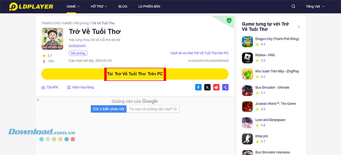 Bước 1: Truy cập liên kết tải Trở Về Tuổi Thơ trên PC để điều hướng tới trang download game của LDPlayer. Sau đó, nhấn vào nút Tải Trở Về Tuổi Thơ trên PC.