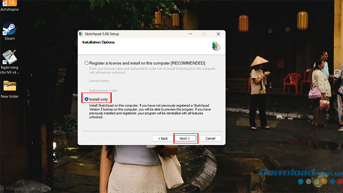 Bước 6: Chọn Register a license and install on this computer để đăng ký giấy phép và cài đặt phiên bản đầy đủ của Geometer’s Sketchpad. Mọi người có thể chọn Install only để dùng thử phần mềm. Sau khi chọn xong, nhấn Next.