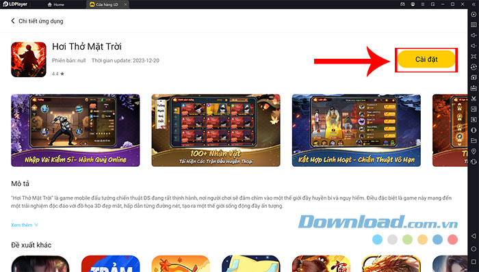 Bước 4: Nhấn nút Cài đặt trong giao diện tải game của Cửa hàng LD. Mọi người sẽ được chuyển đến Cửa hàng Play, tiếp tục nhấn Cài đặt. Thao tác này sẽ bắt đầu quá trình tải xuống Hơi Thở Mặt Trời trong trình giả lập LDPlayer 9.