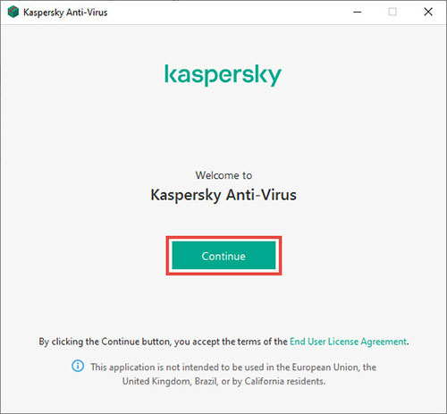 Bước 4: Nhấp vào liên kết để xem lại thỏa thuận cấp phép. Nếu đồng ý với các điều khoản của Kaspersky, hãy nhấp vào Continue.