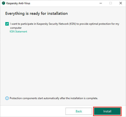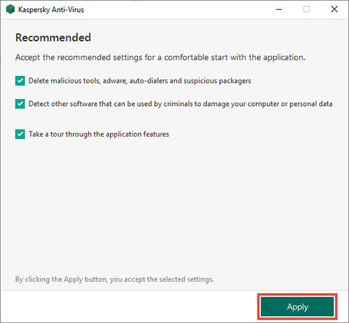 Bước 6: Click vào nút Install và đợi quá trình cài đặt Kaspersky Anti-Virus hoàn tất. Đảm bảo cài đặt mọi người muốn áp dụng đã được chọn và nhấp vào Apply.