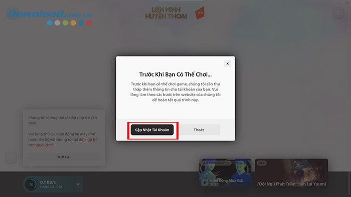 Người chơi cần nhấn vào Cập nhật tài khoản trong cửa sổ có tên Trước khi bạn có thể chơi... để bắt đầu chơi LMHT Riot Games. Các thông tin trò chơi yêu cầu cung cấp bao gồm: