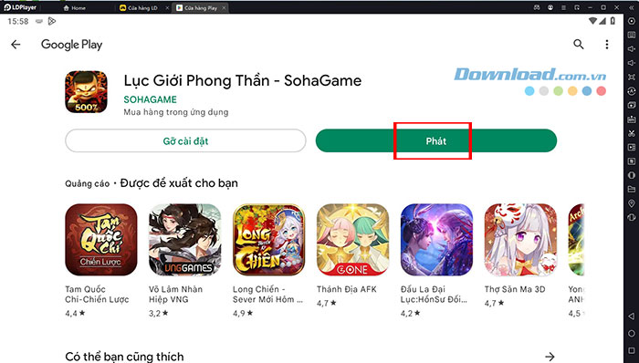 Bước 5: Thao tác này sẽ chuyển mọi người tới Google Play Store, tiếp tục nhấn nút Cài đặt và chờ quá trình tải Lục Giới Phong Thần hoàn tất.