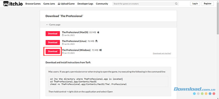 Bước 2: Mọi người sẽ được điều hướng tới trang Download The Professional. Tại đây, nhấn nút Download tại hệ điều hành của thiết bị sử dụng để chơi game. The Professional có thể được chơi trên MacOS, Linux và Windows.