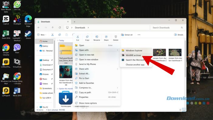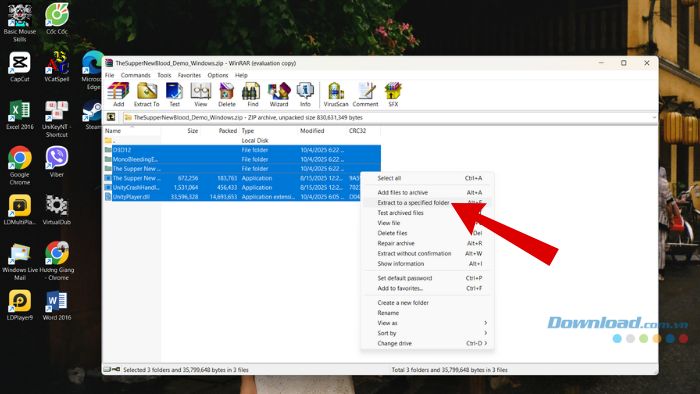 Sau khi file TheSupperNewBlood_Demo_Windows hoàn tất tải xuống, click chuột phải, chọn Open with > WinRAR Archiver để bắt đầu tiến hành giải nén tập tin.