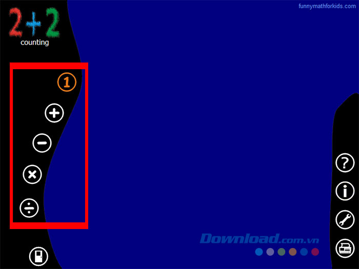 Người dùng có thể lựa chọn các bài học về đếm số, phép tính cộng, trừ, nhân, chia ở bên trái của giao diện.