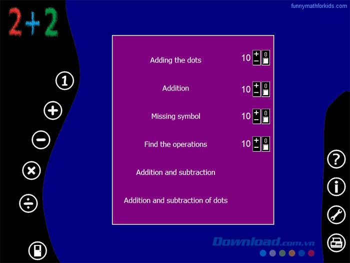 Mọi người cũng có thể tùy chỉnh cài đặt ở bên phải giao diện chính để thay đổi âm nhạc, âm thanh cho bài học thêm phần thú vị, lôi cuốn. Tóm lại, 2+2 Math for Kids là một ứng dụng giúp trẻ em làm quen với các con số, tìm hiểu và thực hành phép toán đơn giản, đảm bảo nắm bắt mọi thao tác cơ bản nhất của toán học.