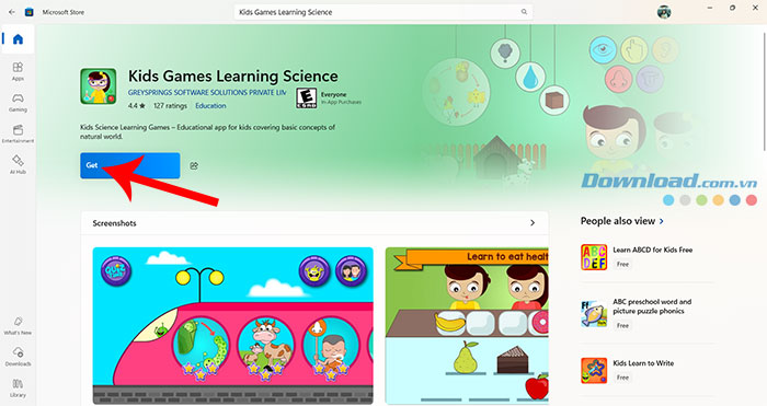 Bước 2: Tại trang tải Kids Science Learning Games, nhấp vào nút Get và đợi ứng dụng hoàn tất tải xuống. Microsoft Store có thể yêu cầu đăng nhập vào tài khoản Microsoft ở bước này để tải ứng dụng, do đó, hãy đăng nhập vào tài khoản trước khi tiến hành tải.