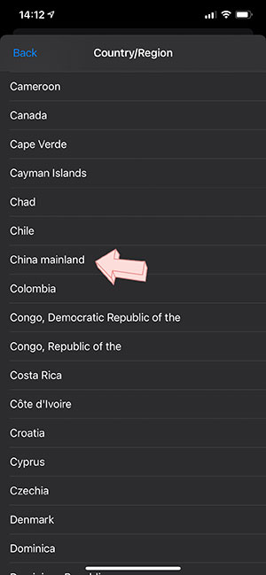 Bước 5: Kéo xuống và chọn Trung Quốc đại lục (China mainland).