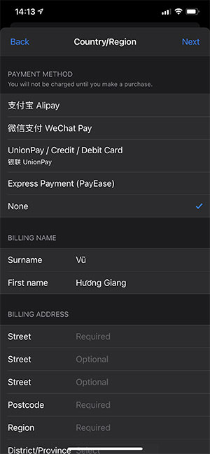 Bước 7: Sau khi chuyển sang mục điền thông tin, chọn Phương thức thanh toán (Payment Method) là Không (None) và chọn Tiếp tục (Next).