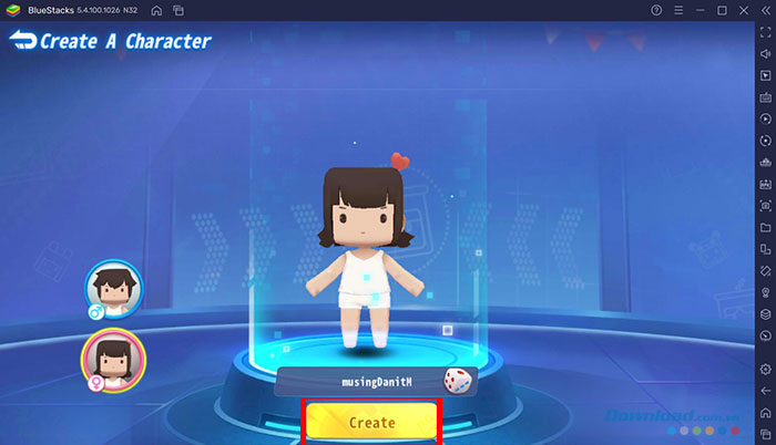 Bước 3: Lựa chọn giới tính và tên nhân vật rồi nhấn vào nút Create.