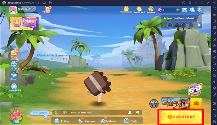 Sau đó trò chơi sẽ đưa mọi người về giao diện chính, hãy chọn Quick Start để thực hành tập luyện các thao tác của Mini World Royale.
