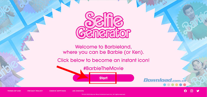 Bước 1: Truy cập Barbie Selfie Generator trên điện thoại hoặc máy tính bằng trình duyệt web thường dùng và nhấp vào Start.