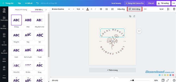 Nhấn vào từng thành phần của hình ảnh (văn bản hoặc biểu tượng,...), chọn Hình động ở thanh công cụ phía trên để tạo các chuyển động giống một ảnh GIF thông thường.