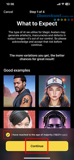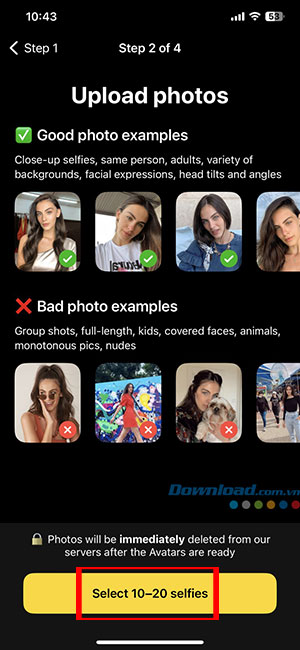 Bước 5: Nhấn vào Select 10-20 selfies và chọn hình ảnh. Ứng dụng khuyến nghị sử dụng ảnh cận cảnh, ảnh người lớn, nhiều phông nền và nét mặt khác nhau. Nó khuyên người dùng tránh chụp ảnh nhóm, ảnh trẻ em, ảnh che mặt và ảnh khỏa thân.