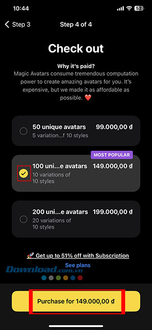 Bước 7: Đã đến lúc phải trả phí với nhiều tùy chọn như 50 hình đại diện có giá 99.000đ, 100 ảnh có giá 149.000đ và 200 ảnh là 199.000đ.