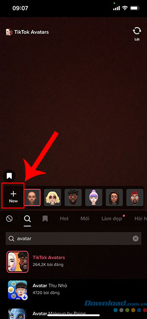 Bây giờ mọi người sẽ thấy một slide với các preset avatar có sẵn trên màn hình. Nhấn vào + Mới, sau đó cuộn xuống và chọn một preset mà mọi người cảm thấy gần giống với mình nhất. Vì TikTok không có tùy chọn bắt đầu với canvas trống nên giá trị đặt trước người dùng chọn sẽ là điểm bắt đầu.