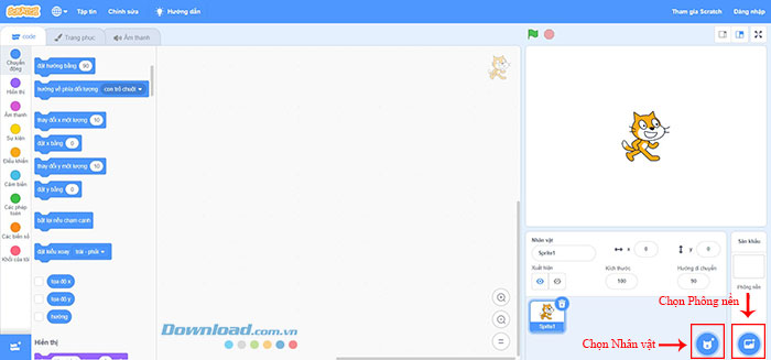 Sau khi đã mở Scratch, tạo một dự án trống, người dùng có thể chọn từ nhiều tùy chọn phông nền và nhân vật khác nhau. Nhấn vào hai vòng tròn ở góc dưới cùng bên phải, biểu tượng hình ảnh để chọn phông nền và biểu tượng con mèo là để chọn nhân vật.