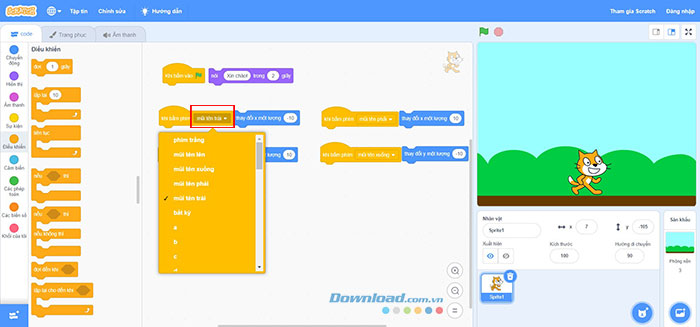 Nhân vật có thể di chuyển trái, phải, lên và xuống nếu các phím mũi tên tương ứng được nhấp. Từ Sự kiện, kéo thả khối khi bấm phím mũi tên trái (nhấn mũi tên để mở menu thả xuống và chọn các nút mũi tên khác) > thay đổi x một lượng 10 ở Chuyển động (lượng x có thể tùy chỉnh).