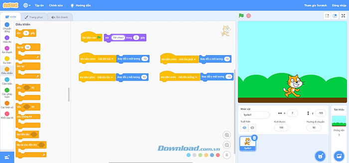 Để tạo chuyển động lên, chọn khối khi bấm phím mũi tên lên > thay đổi y một lượng 10. Để tạo chuyển động xuống, chọn khi bấm mũi tên xuống > thay đổi y một lượng -10 (các giá trị của x và y có thể thay đổi tùy ý).
