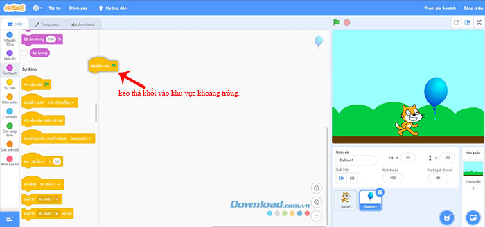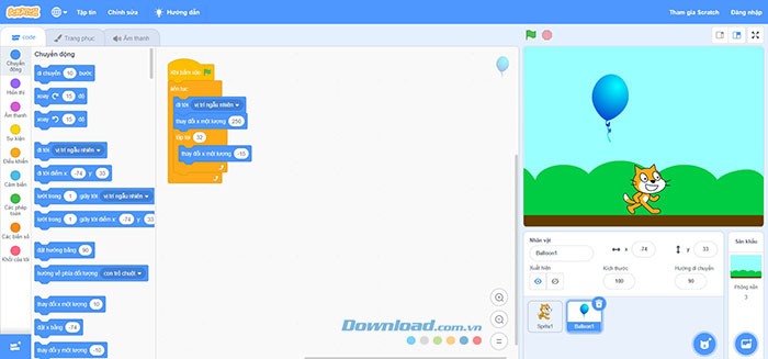 Sau đó, hãy nhấp vào quả bóng bay bắt đầu viết mã cho nó. Để làm cho quả bóng bay, chọn khi bấm vào lá cờ xanh > liên tục (trong Điều khiển) > đi tới vị trí ngẫu nhiên > thay đổi x một lượng > lặp lại > thay đổi x một lượng.