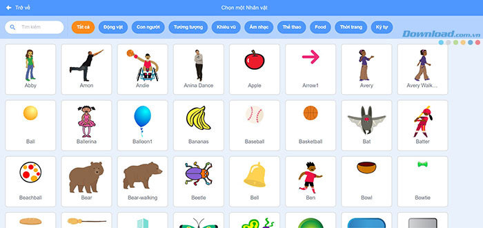 Nhấn vào hình tròn chọn nhân vật và thêm một nhân vật hoặc vật thể khác. Trong ví dụ này là một quả bóng bay với mục đích cho nhân vật con mèo chạy đuổi theo quả bóng.