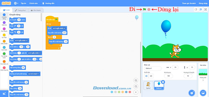 Vậy là mọi người có thể tạo phần mở đầu có một chú mèo đang chạy đuổi theo quả bóng bay và nói xin chào. Có thể áp dụng cách làm tương tự để tạo phần kết thúc cho dự án Scratch bằng cách thay Xin chào thành Tạm biệt hoặc bất kỳ lời thoại nào.