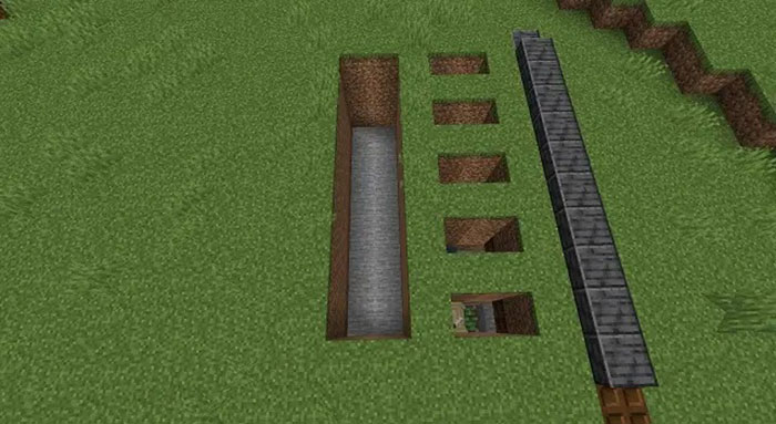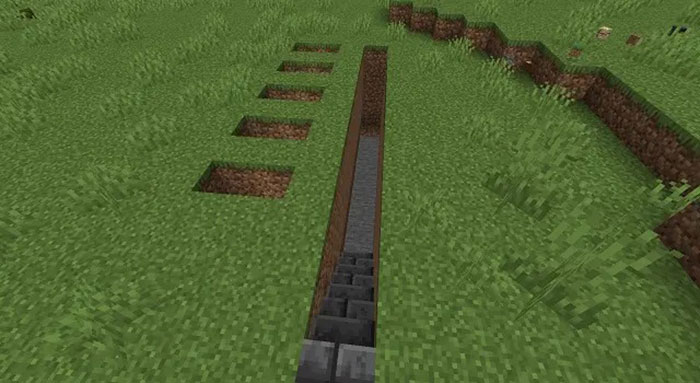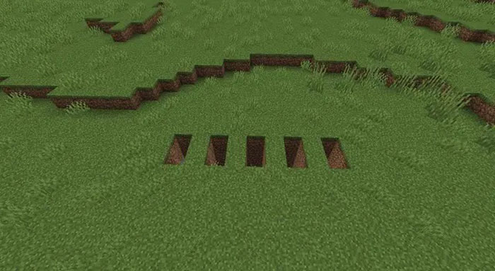 Sau đó, đào nhiều hố dài 2 khối và sâu 5 khối, hãy đào ít nhất 5 hố, mỗi hố cách nhau 1 khối.