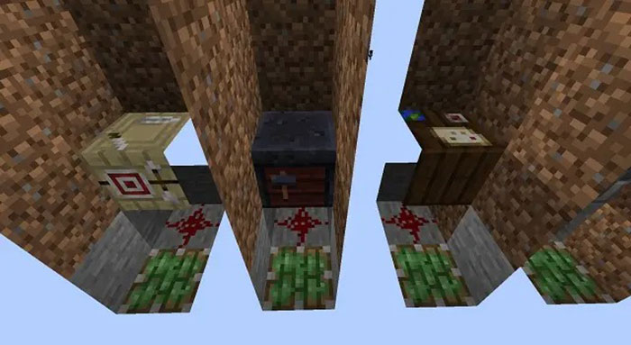 Sau đó, đặt các khối xây dựng khác nhau lên trên bụi Redstone trong mỗi hố. Mọi người có thể thay thế khối theo yêu cầu trao đổi của mình sau này.