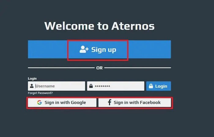 Bước 2: Trên trang tiếp theo mở ra, người dùng cần tạo một tài khoản Aternos để bắt đầu. Mọi người có thể sử dụng Google hoặc Facebook để đăng ký, hoặc nhấn nút Sign up để tạo tài khoản mà không cần sử dụng thông tin đăng nhập mạng xã hội của mình.