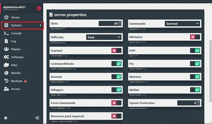 Để thay đổi cài đặt máy chủ cơ bản, hãy nhấp vào Options trong bảng điều khiển bên trái. Tại đây có thể điều chỉnh các thuộc tính cơ bản như chế độ trò chơi, độ khó và cài đặt spawn cho một số thực thể.