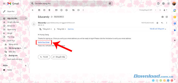 Bước 9: Mở Email đã dùng đăng ký tài khoản để xác thực tài khoản Educandy.