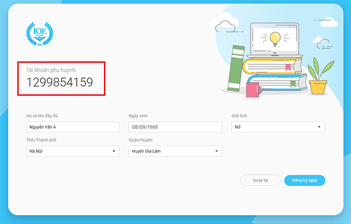 Bước 6: Hoàn thành các thông tin phụ huynh và click Đăng ký ngay để hoàn tất đăng ký tài khoản phụ huynh.