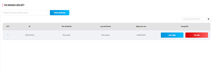 Bước 3: Tại mục Tài khoản liên kết sẽ hiển thị ID của phụ huynh, học sinh bấm Xác nhận để hoàn tất quá trình liên kết.