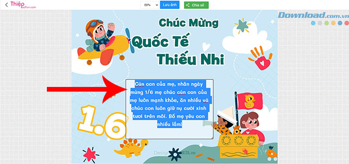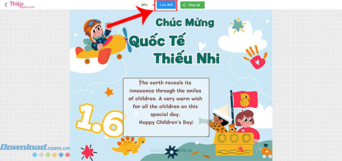 Chọn một trong các mẫu thiệp Ngày Quốc tế Thiếu nhi 1/6 ở trên > nhập lời chúc của mình vào thiệp > nhấn nút Lưu ảnh > nhấn nút Save.