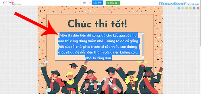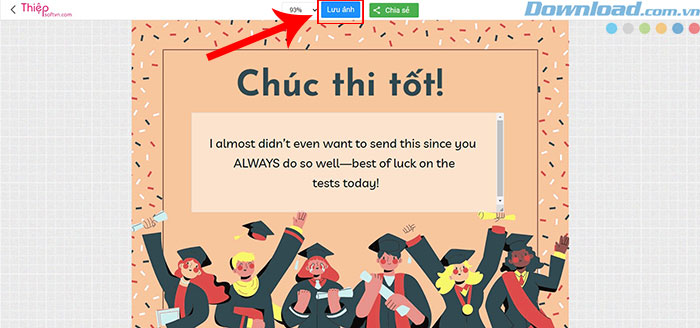 Chọn một trong các mẫu thiệp chúc thi tốt ở trên > nhập lời chúc, lời động viên của mình vào thiệp > nhấn nút Lưu ảnh > nhấn nút Save.