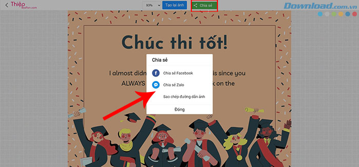 Bước 4: Đặt tên cho file ảnh và nhấn nút Save (nếu có). Bây giờ mọi người cũng có thể nhanh chóng gửi thiệp bằng cách nhấn vào Chia sẻ để chia sẻ qua mạng xã hội như Facebook và Zalo hoặc bất kỳ ứng dụng nhắn tin nào.