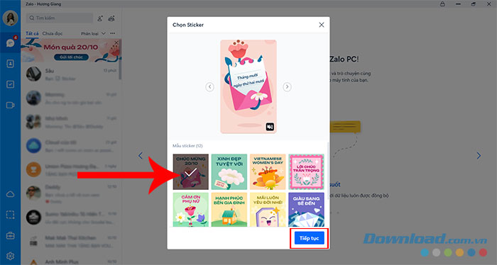 Bước 2: Click vào để xem qua 12 mẫu sticker mà Zalo PC cung cấp. Khi đã chọn được sticker ưng ý, hãy nhấn vào mẫu sticker nhạc 20/10 đó và ấn Tiếp tục.