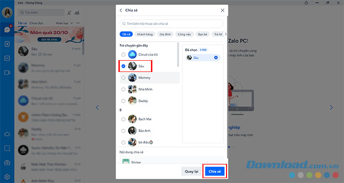 Bước 3: Chọn người nhận và nhấn nút Chia sẻ để gửi sticker nhạc kèm lời chúc 20/10 tới người đó.