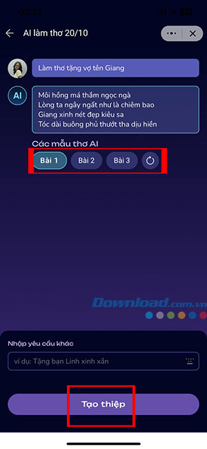 Bước 3: AI sẽ bắt đầu viết một bài với đối tượng và tên người nhận thiệp mọi người đã chọn. Chạm vào Bài 1, Bài 2,... để xem qua các mẫu thơ AI khác nhau. Nếu đã ưng ý với bài thơ, hãy ấn nút Tạo thiệp.