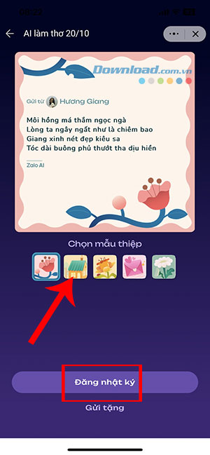 Bước 4: Chọn 1 mẫu thiệp cho bài thơ và ấn nút Đăng nhật ký hoặc Gửi tặng để chia sẻ tới người khác.