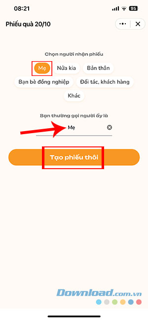 Bước 2: Chọn người nhận phiếu (Mẹ, Nửa kia, Bạn bè đồng nghiệp,...) và nhập tên người đó vào mục Bạn thường gọi người ấy là. Sau đó ấn nút Tạo phiếu thôi.