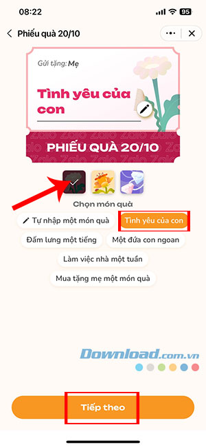Bước 3: Chọn 1 trong 3 mẫu phiếu quà và các món quà để tặng người đó. Người dùng có thể tự nhập nội dung món quà sẽ hiển thị trong phiếu vào nhấn Tiếp theo.