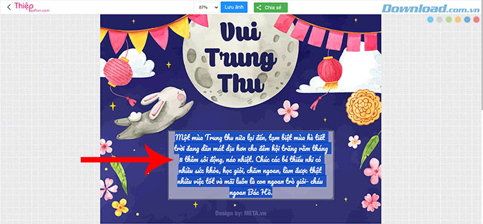 Lựa chọn một mẫu thiệp Tết Trung Thu được cung cấp phía trên > nhập lời chúc, lời nhắn vào phần trống của thiệp > nhấn nút Lưu ảnh > nhấn Save để tải thiệp điện tử về thiết bị.