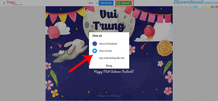 Bước 4: Ngoài ra, mọi người có thể nhanh chóng gửi thiệp bằng cách chọn Chia sẻ để gửi thiệp qua Zalo hoặc Facebook cho người thân.