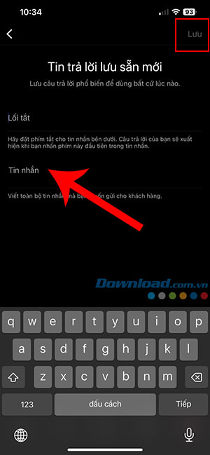 Bước 4: Nhập Lối tắt/phím tắt và nội dung Tin nhắn vào các mục tương ứng. Khi nhập lối tắt, câu trả lời đầy đủ ở tin nhắn sẽ xuất hiện và mọi người có thể trả lời một cách nhanh chóng mà không cần nhập toàn bộ câu trả lời.