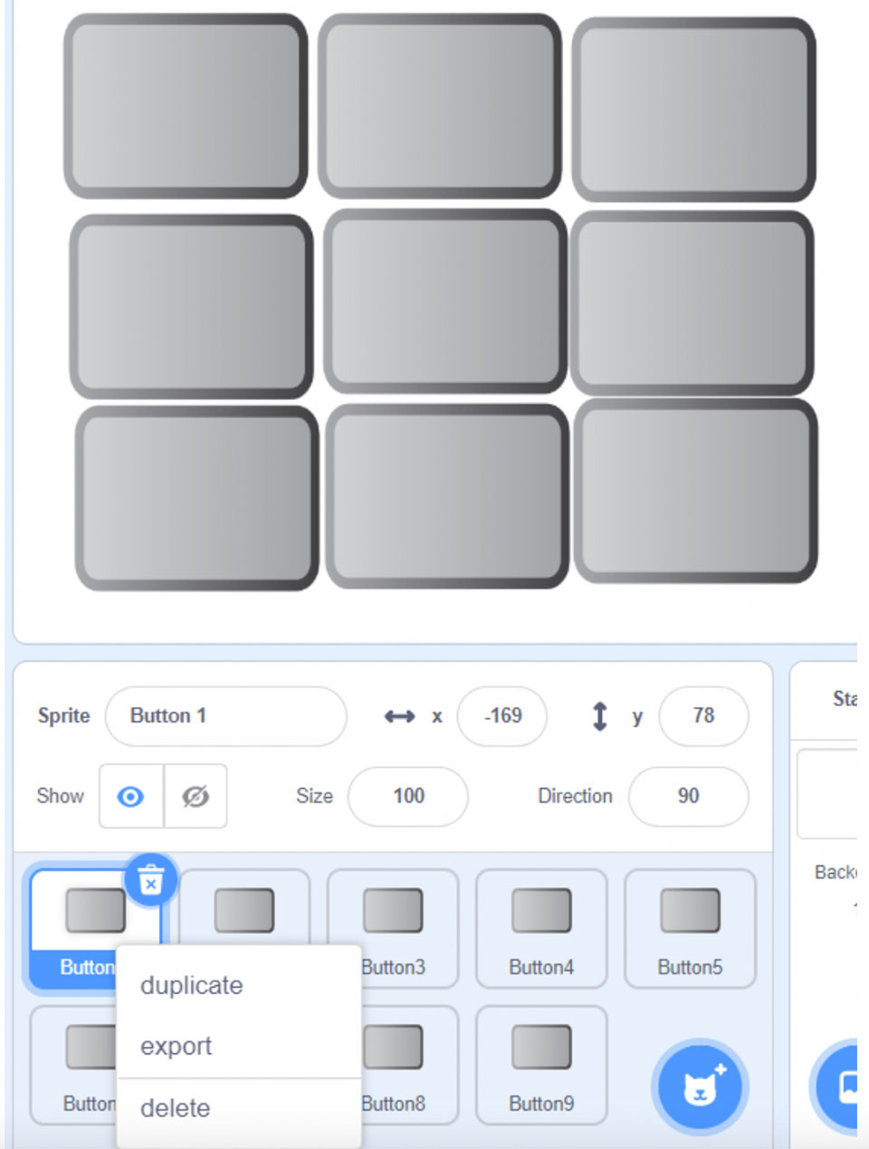 Chỉ cần nhấp chuột phải vào Button Sprite và chọn Duplicate để tạo thêm 8 ô nữa, sau đó sắp xếp chúng cạnh nhau thành ba hàng và ba cột:
