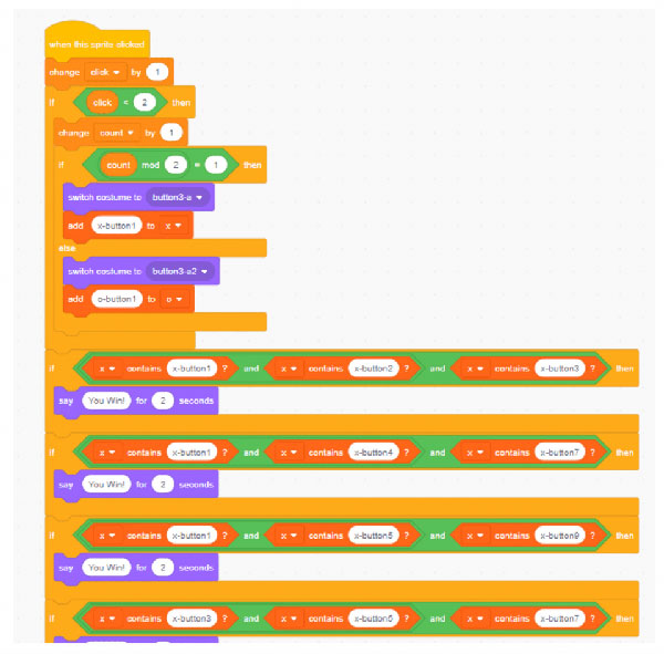 Nếu một danh sách có một trong ba mô tả nằm trong danh sách chiến thắng, thì đã tìm ra người chiến thắng. Ví dụ, nếu danh sách X có x-button1, x-button2 và x-button3, biểu diễn hàng đầu tiên của trò chơi, thì có người chiến thắng. Sử dụng điều kiện if/then để kiểm tra tất cả 8 giải pháp có thể cho cả danh sách X và O:
