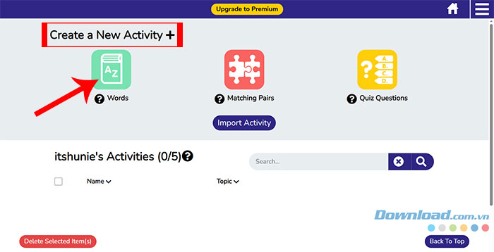 Mọi người cần nhấn vào Create a New Activity và chọn một kiểu trò chơi muốn tạo (ví dụ: Words, Matching Pairs hoặc Quiz Questions). Bài viết này chọn trò chơi từ ngữ Words.