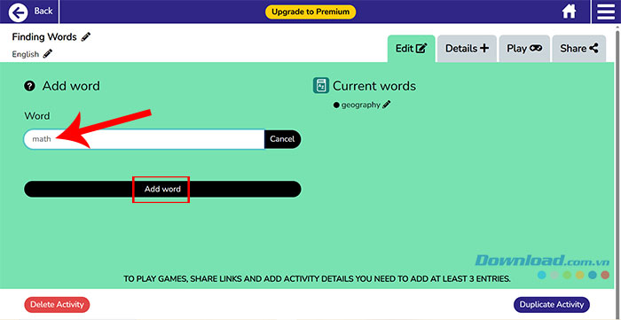 Bước 4: Nhập một loạt các từ ngữ muốn đưa vào trò chơi và nhấn Add word. Kiểu trò chơi này phù hợp cho các môn yêu cầu học từ mới, ví dụ như Tiếng Anh. Các từ được thêm vào sẽ xuất hiện ở mục Current words phía bên phải.